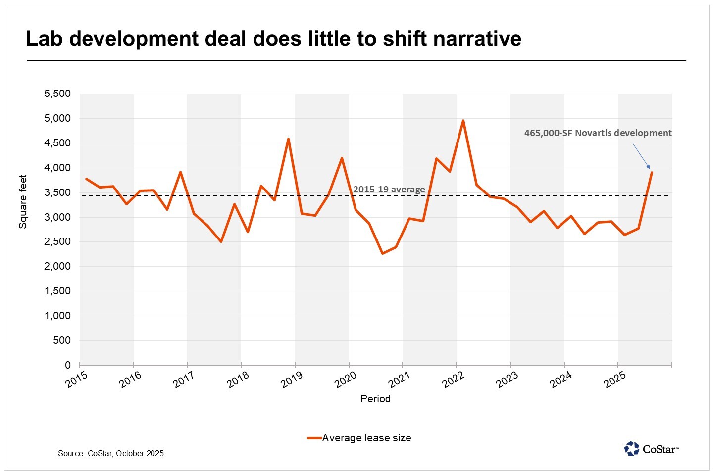 While leasing volume rose 40% quarter over quarter to its highest level in over two years, it was not indicative of the demand environment thawing. Instead, it was driven by a 465,000-square-foot development deal for Novartis to build a lab project in UTC.